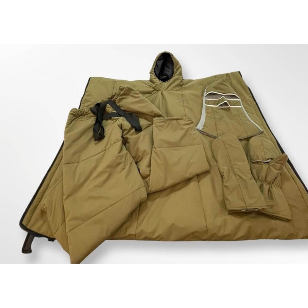 - Полный комплект маскировочной тактической одежды «Невидимка» / КМТО-5 на зиму включает в себя пончо, маску, штаны, бахилы и рукавицы.